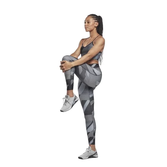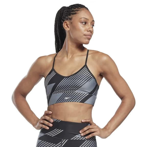 The Reebok Sport Logo Workout Ready Bra is designed for medium-impact workouts such as weights or the elliptical. It features a flattering plunge neckline and removable cups to personalise the level of cover. The dynamic print is an update on a design from our archive.
